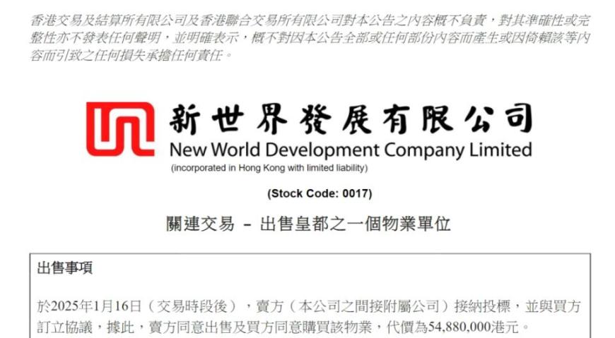 黄少媚购买的物业位于新世界发展旗下的北角皇都项目,是该项目面积最大的33楼A1单位,实用面积1522平方呎(约141.34平方米),同时还包括一个停车位。交易单价高达36058港元/平方呎(约38.8万港元/平方米,36.5万元人民币/平方米)。
