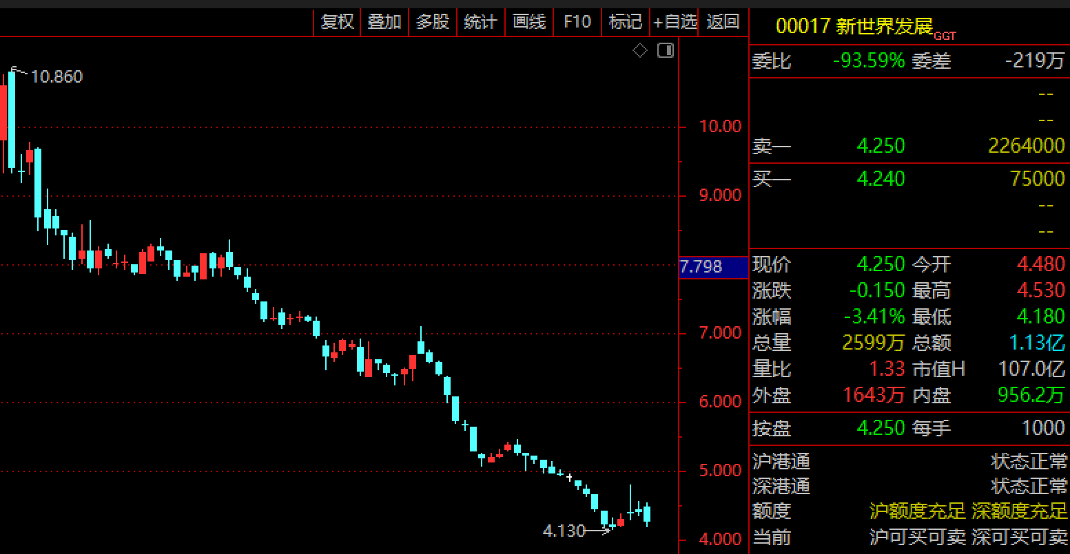资本市场方面,新世界发展一路下跌,去年10年以来的跌幅高达60%,市值蒸发160多亿。近5年,新世界发展更是从45港元持续下跌至4港元,跌幅高达90%,市值蒸发千亿。